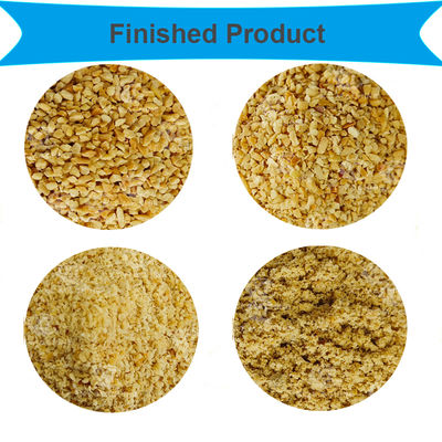 This industrial peanut chopper processes roasted peanuts into uniform particles through a two-stage chopping system. Peanuts are fed via vertical conveyor, initially chopped into coarse particles, then refined in the second stage. An integrated vibrating screen removes impurities and sorts particles into four specifications: above 4mm, 2.5-4mm, 1.8-2.5mm, 1.4-1.8mm, and below 1.4mm.