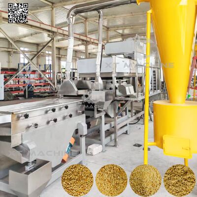The machine features a two-stage chopping process. Split blanched peanuts are fed into the chopper via a vertical conveyor, where they are first chopped into coarse grains by the initial chopping device. The material then flows into the second stage chopping mechanism, producing mixed granulators. With an integrated vibrating sifter, the output is sorted into four uniform specifications, typically divided into 5-8 mesh, 8-10 mesh, 10-12 mesh, with material below 12 mesh achieving a powder texture.