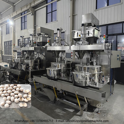 This advanced automatic coating system processes peanuts, cashew nuts, melon seed kernels, and other food products. Features include a base material feed hopper with pneumatically controlled slide gate and PLC-controlled weighing scale for precise measurement.